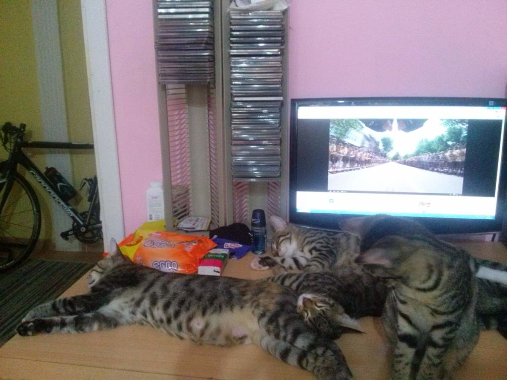 July 5, 2015, a peaceful Sunday at home with the cats. Watching Tour de France, then some classical music videos, while my dear Lotto and her three kittens are on my table.